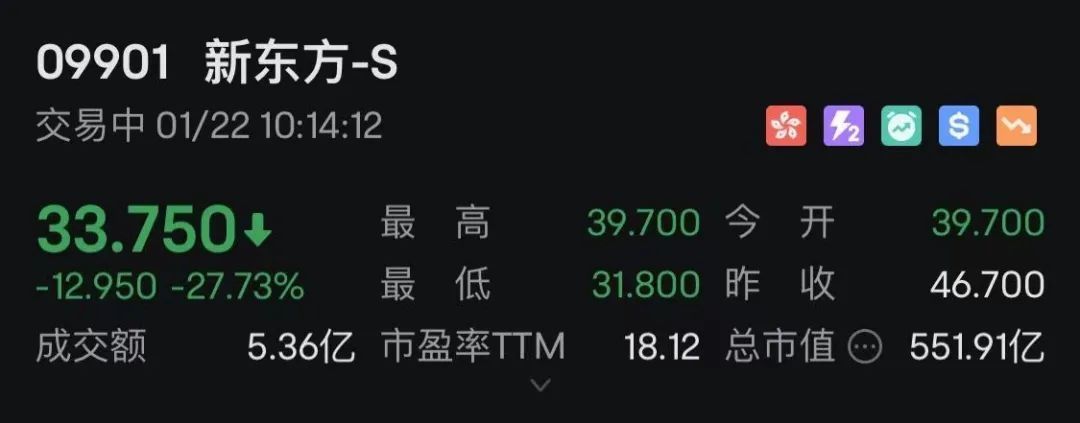港股新东方绩后低开,跌幅一度扩大至30%,截至发稿仍跌27.73%,东方甄选盘初跌逾6%。